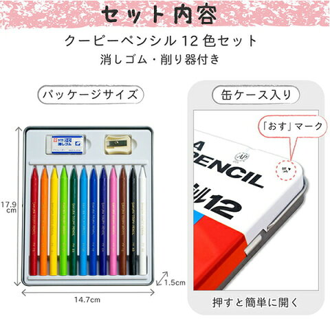 サイズ183×148×23mm 170g材質セットバコ:PP | 中仕切:PP | ケズリ:勤続・PS | 消しゴム:PVC・PP・紙内容12色:きいろ・だいだいいろ・うすだいだい・ちゃいろ・あか・ももいろ・むらさき・みずいろ・きみどり・みどり・あお・くろ特徴色鉛筆とクレヨンの長所を生かした全芯タイプの色鉛筆。
