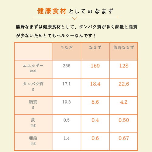 原材料 真なまず(養殖、和歌山県新宮産)、でんぷん粉(国内製造)、醤油(小麦・大豆を含む、国内製造)、砂糖、食用とうもろこし油、みりん 添付タレ:醤油(小麦・大豆を含む、国内製造)、砂糖、みりん 内容量 熊野なまず蒲焼(タレ付き)[70g×3パック、タレ15ml×3個] 賞味期限 製造日から365日 解凍後5日 原産地 和歌山県新宮市 提供元 新宮港埠頭株式会社TEL : 0735-31-8110 注意事項 ※賞味期限は冷凍の場合でございます。