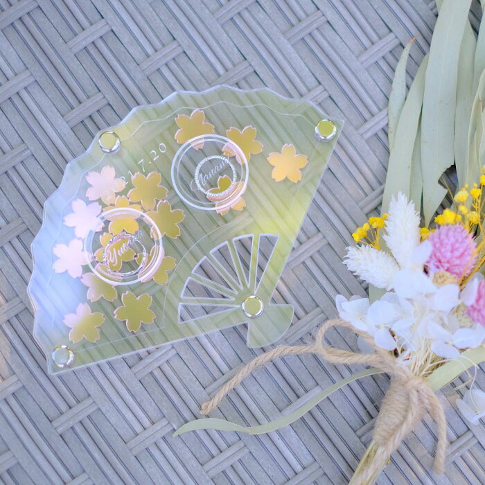オーダー箇所 ・お二人のお名前 (ローマ字)・結婚記念日、挙式日などの日付【扇子型 リングピロー 結婚式 和婚】送料無料 和装婚 ミラーアクリル ピンクゴールド 結婚指輪 結婚式 結婚準備 結婚祝い ウェルカムスペース ウェルカムボード ウェディング小物 名入れ 名前入り 記念品 ギフト 記念日 シンプル おしゃれ オーダー 結婚式の演出におすすめ 和婚にぴったりな扇子型リングピロー 綺麗なミラーアクリルの桜が扇子の中に入ったリングピローです。