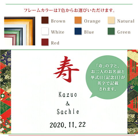 結婚祝い、結婚式のウェルカムボード、両親へのプレゼントはもちろん、父の日・母の日や還暦などの長寿祝い、退職祝い、結婚記念日、金婚式、銀婚式、命名、出産祝い、家族の記念など、様々なギフトシーンでお贈りいただけます。