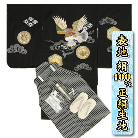 七五三 5歳 男の子 正絹 着物袴セット 総刺繍見返り鷹柄正絹羽織着物 金駒刺繍 黒縞正絹袴 手絞り 12点セット 足袋付きセット 日本製
